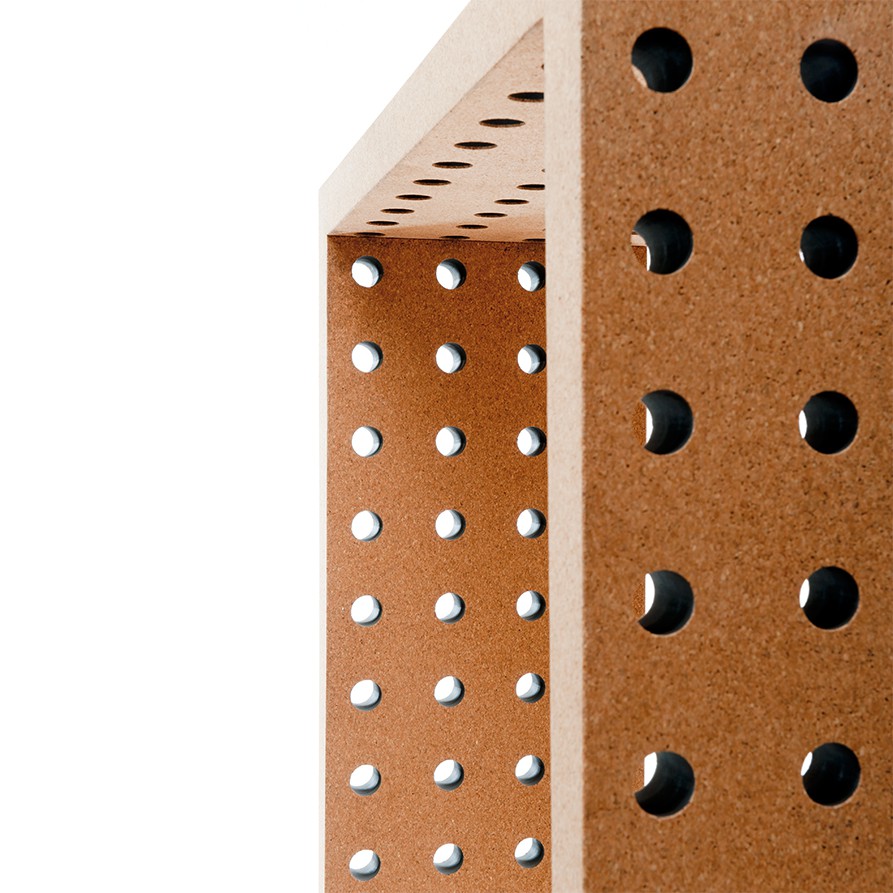 The One Sixty-Four cork sideboard is the name for a piece with 164 perfect holes. The black holes and the larger grain scale of the cork texture surface adds a very original look and feel to the sideboard. One Sixty-Four is made of a natural agglomerate cork and black waterproof MDF sandwich.