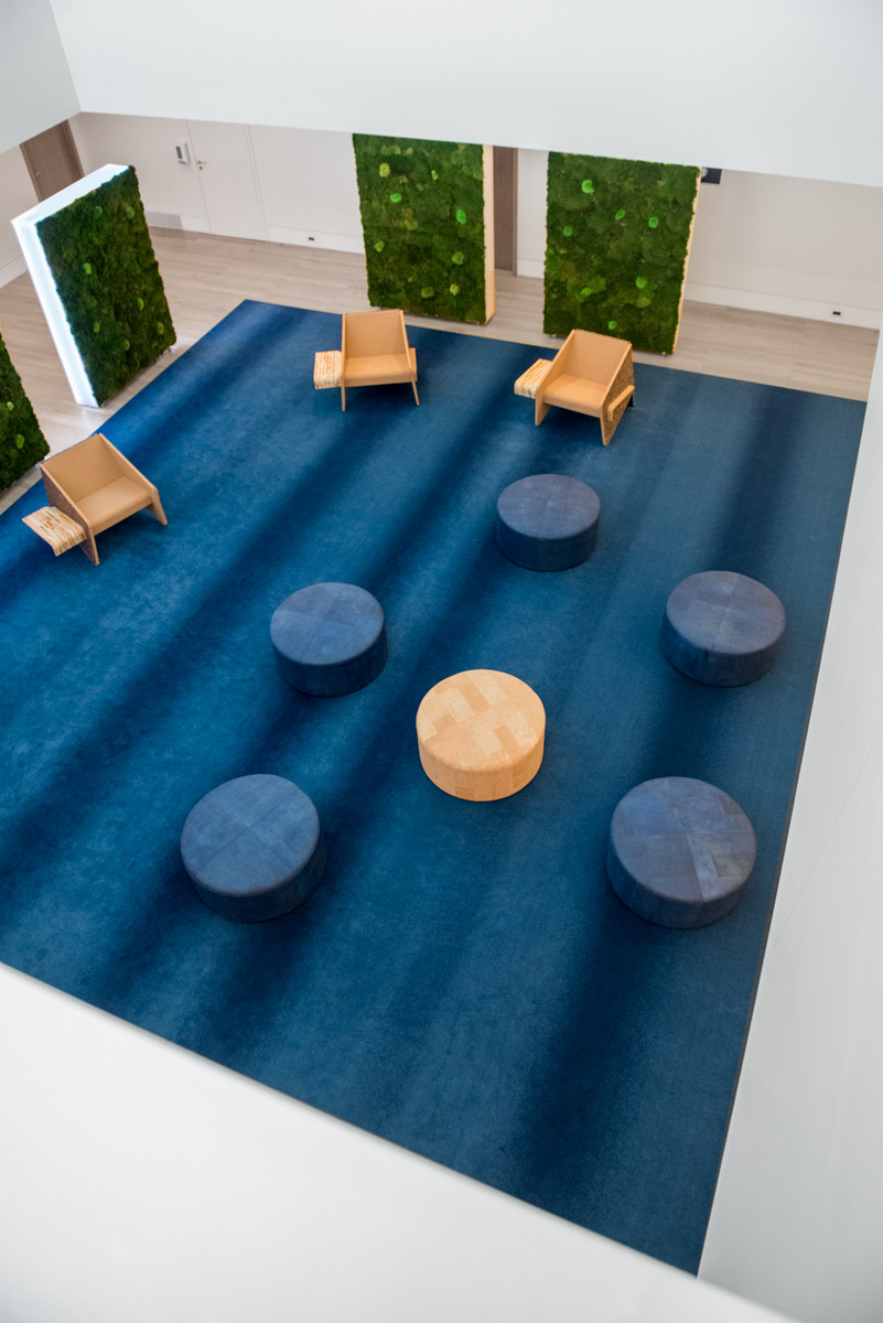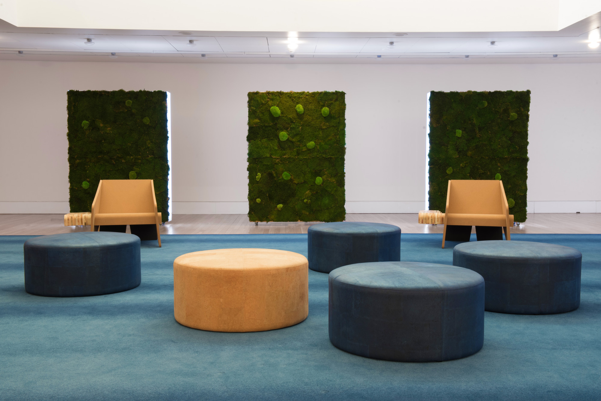 The Dot puff was designed for the lounges of the 2021 Portuguese Presidency of the Council of the European Union. In keeping with the “oceans” and the “Portuguese forests” themes of the PPUE 2021, the puff utilizes cork leather in gold and blue tones. The Dot puff uses low density eco-foam as the filling, and low impact woods for the structure, and can be built to size.