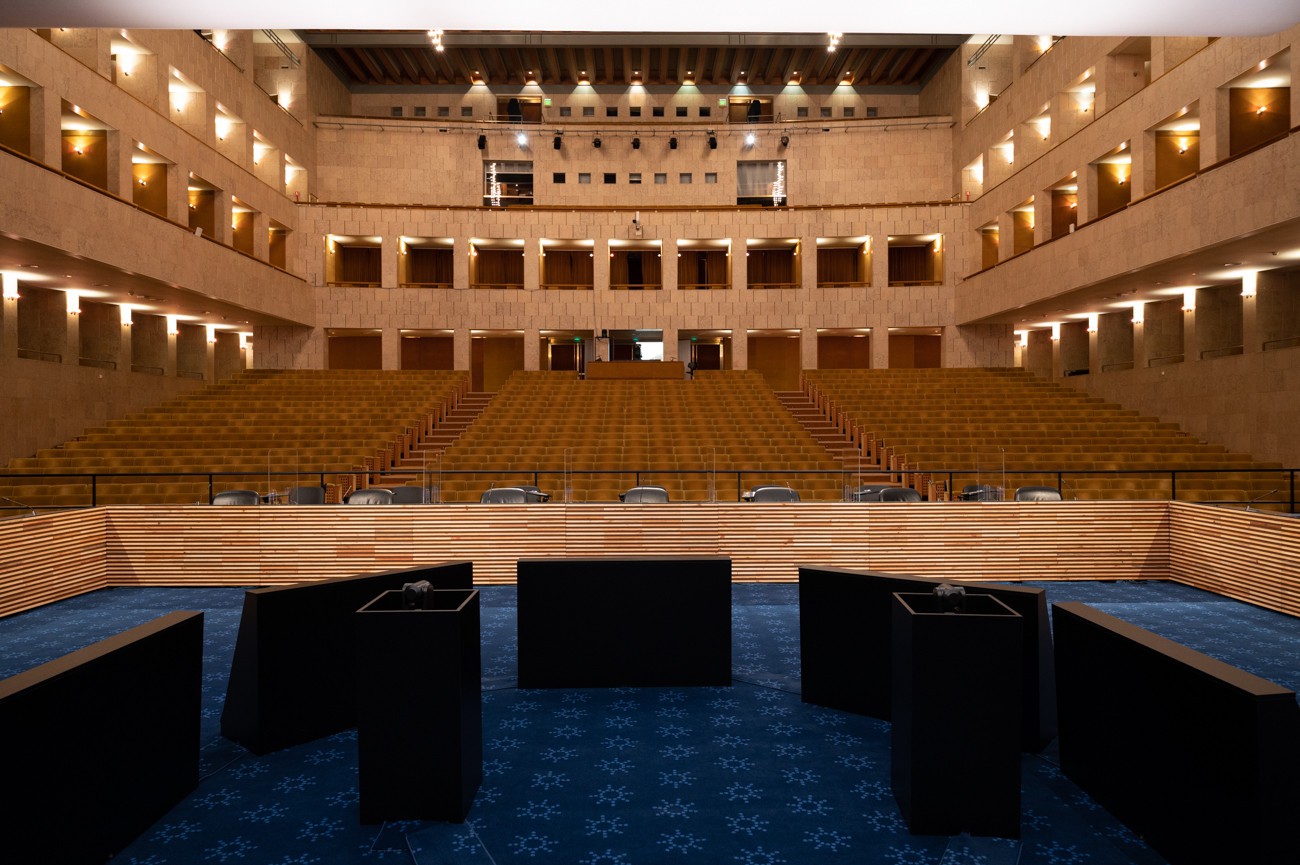 The PPUE 2021 Ministerial Table was first assembled at the CCB's Grand Auditorium in April 2021 in a rectangular format, comprising 44 tables. In line with the client's request, the front panel of the table modules was redesigned to comprise alternating lines of toasted cork and pine, which created a uniform, infinite structure. The legs were also redesigned in order to accommodate irregular seating positions. The public debut of the table was at the Informal Meeting of the Council of the European Union on May 8, 2021, in Porto at the Rosa Mota Pavillion, Super Bock Arena. Due to the unique circular structure of the Arena, extra parts were designed to allow the table to be attached in a circular layout with 34 tables. In addition to the extra parts, name plates for each of the countries and participants were produced in laser-engraved cork. The table was then transported to the city of Coimbra for the Informal Meeting of Ministers for EU Affairs and Foresight on 17 May 2021, and was set up in a rectangular format integrating 32 tables. After Coimbra, SUSDESIGN's ministerial table was set up back at the CCB's Grand Auditorium for various meetings on 27 May 2021, integrating 44 tables.